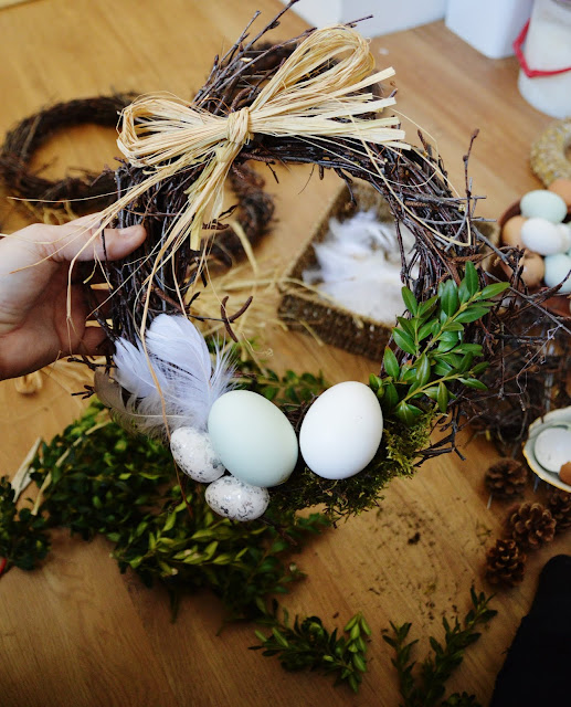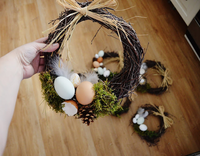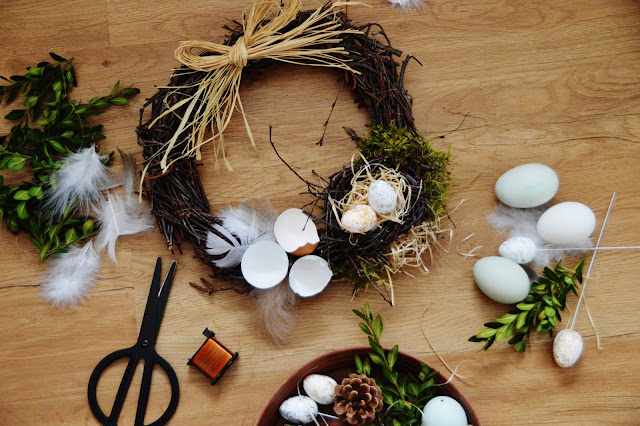 - vyfouklá vejce různých barev (u nás ve slepičárně kupuji ta zelená - prý jsou zdravější, mají méně cholesterolu a na věncích teda vypadají skvěle)